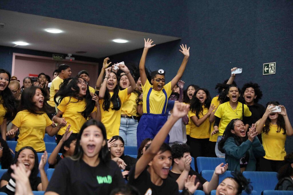 Em seguida, os alunos da turma do 9º ano 1 apresentaram a música “Happy”, do cantor Pharrell Williams, presente no filme “Meu Malvado Favorito 2”. Recriando cenas marcantes do filme com muito entusiasmo, os alunos garantiram a estatueta e comemoraram junto com a coreógrafa Evelyn Cristiny.