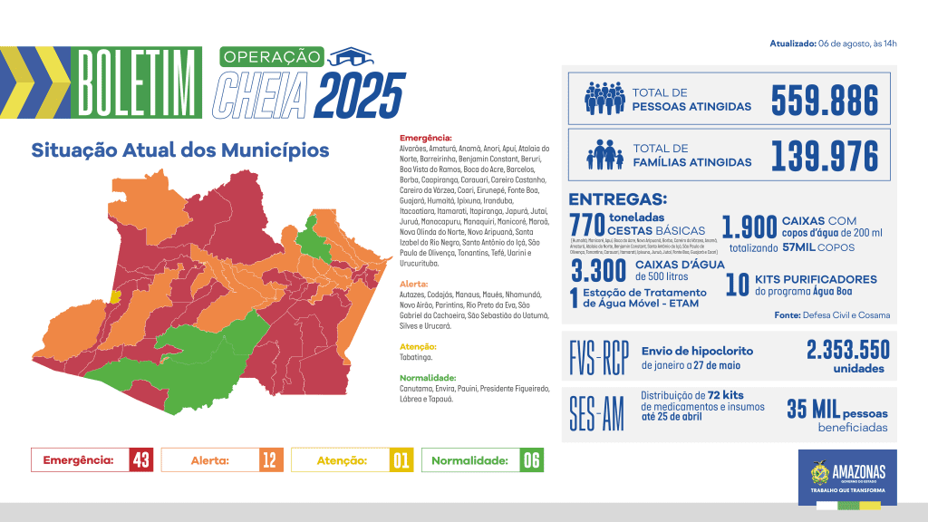 Até o momento, 139.976 famílias foram afetadas em todo o Amazonas, aproximadamente, 559.886 pessoas impactadas diretamente. As nove calhas de rios do Amazonas já estão em processo de vazante.