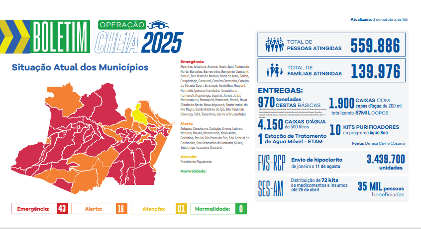 Até o momento, 139.976 famílias foram afetadas em todo o Amazonas, aproximadamente, 559.886 pessoas impactadas diretamente. As nove calhas de rios do Amazonas já estão em processo de vazante.