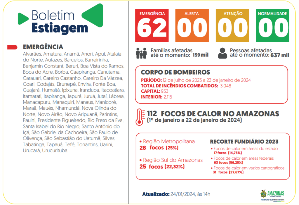 Boletim Estiagem 2024 Governo do Amazonas divulga boletim sobre a estiagem no estado desta quarta-feira (24/01) 24 de janeiro de 2024 às 15:55 Informativo conta com atualizações dos sistemas de monitoramento Para mais informações, clique e confira o boletim completo sobre a estiagem.