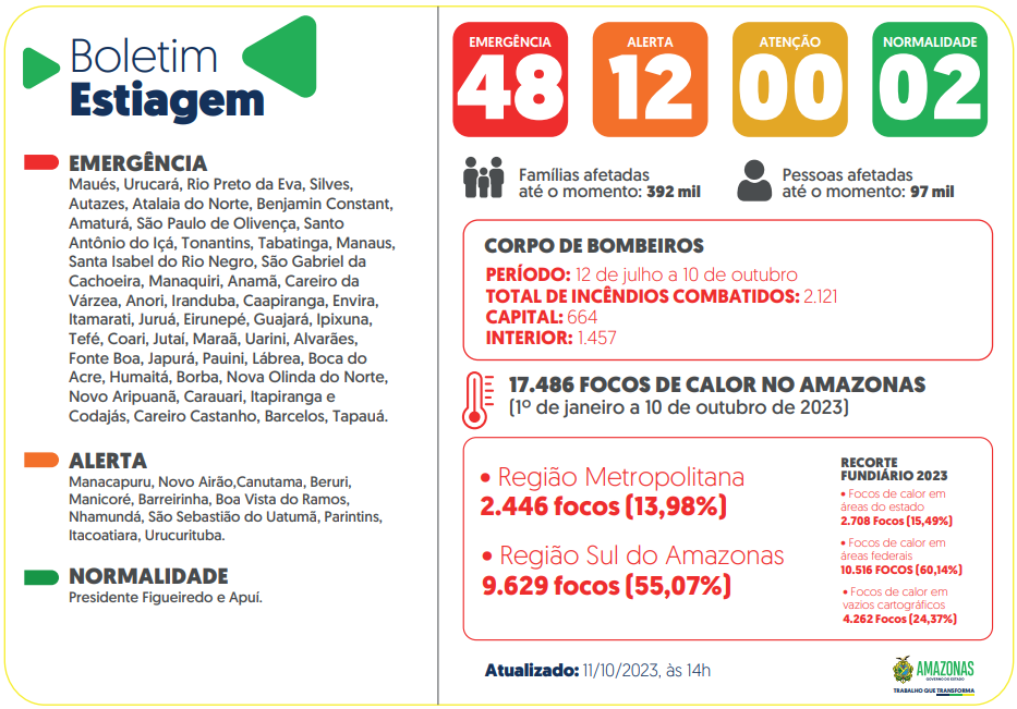 Estiagem 2023 Governo do Amazonas divulga boletim sobre a estiagem no estado nesta Quarta-feira (11/10) 11 de outubro de 2023 às 17:12 Informativo conta com atualizações dos sistemas de monitoramento Para acessar o boletim completo clique aqui.