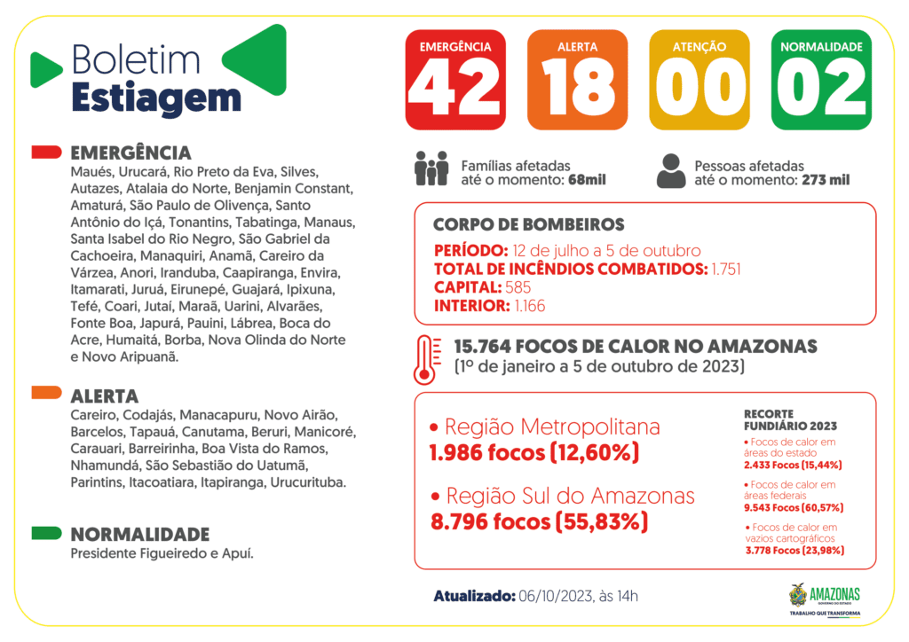 Estiagem 2023 Governo do Amazonas divulga boletim sobre a estiagem no estado nesta sexta-feira (06/10) 06 de outubro de 2023 às 15:07 Informativo conta com atualizações dos sistemas de monitoramento Para mais informações, clique e confira o boletim completo sobre a estiagem de 2023
