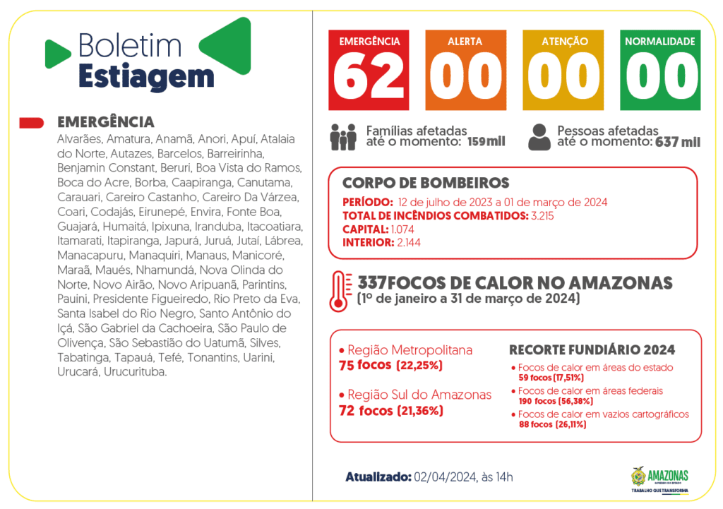 Boletim Estiagem 2024 Governo do Amazonas divulga boletim sobre a estiagem no estado nesta terça-feira (02/04) 02 de abril de 2024 às 10:19 Informativo conta com atualizações dos sistemas de monitoramento Boletim sobre a estiagem