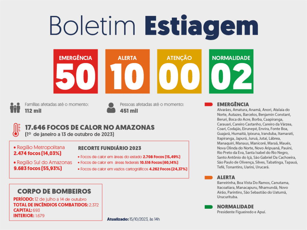Estiagem 2023 Governo do Amazonas divulga boletim sobre a estiagem no estado neste domingo (15/10) 15 de outubro de 2023 às 16:59 Informativo conta com atualizações dos sistemas de monitoramento Para mais informações, clique e confira o boletim completo sobre a estiagem de 2023