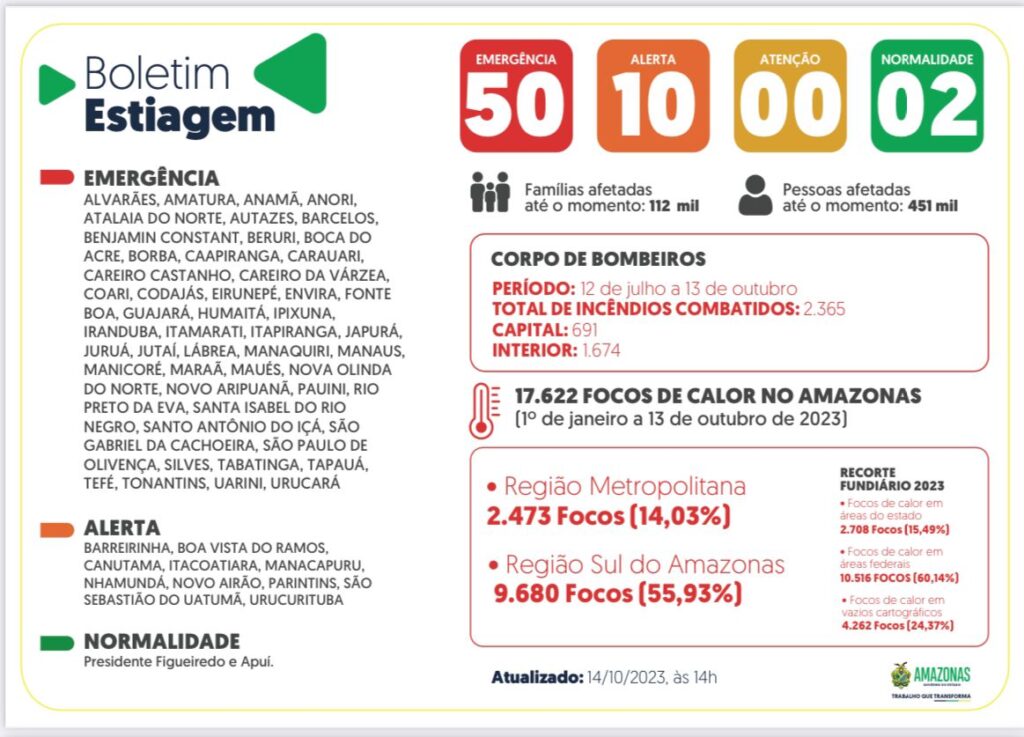 Estiagem 2023 Governo do Amazonas divulga boletim sobre a estiagem no estado neste sábado (14/10) 14 de outubro de 2023 às 20:04 Informativo conta com atualizações dos sistemas de monitoramento Para mais informações, clique e confira o boletim completo sobre a estiagem de 2023