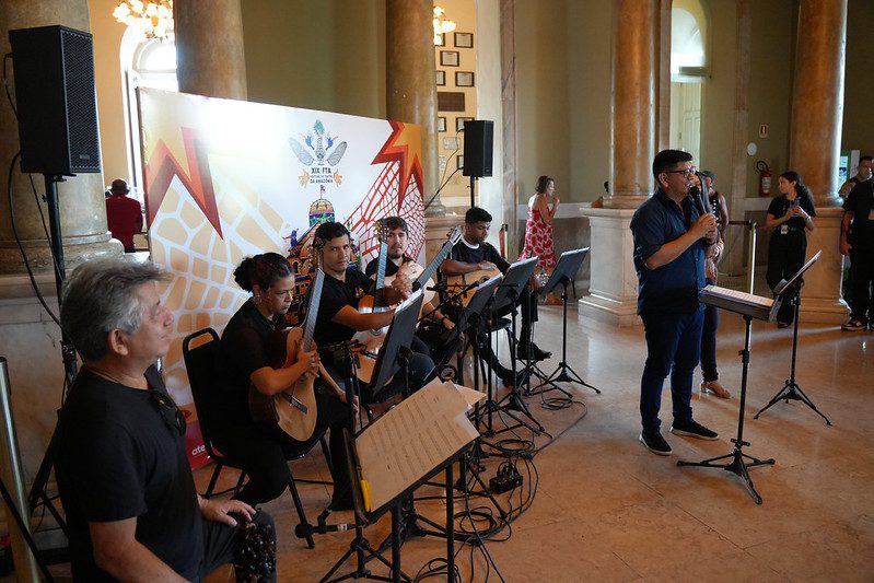 O som do violão ecoou pelo Hall do centenário Teatro Amazonas, nesta sexta-feira (03/10), em um encontro musical que resgatou as raízes da cultura nortista. O evento “Sarau no Hall”, promovido pela Orquestra de Violões do Amazonas (OCA), reuniu dezenas de visitantes e amantes da música regional em uma apresentação gratuita, marcada pela emoção e pela celebração da memória musical do povo amazonense. A programação é uma iniciativa do Governo do Amazonas, por meio da Secretaria de Cultura e Economia Criativa.